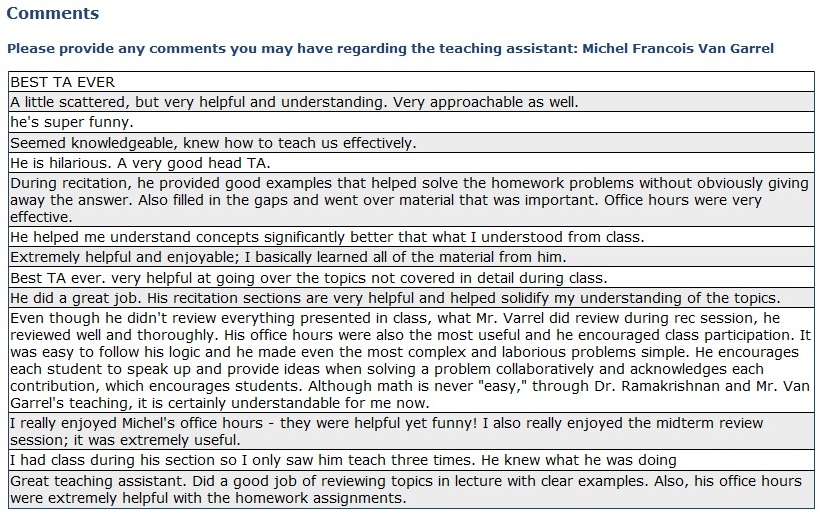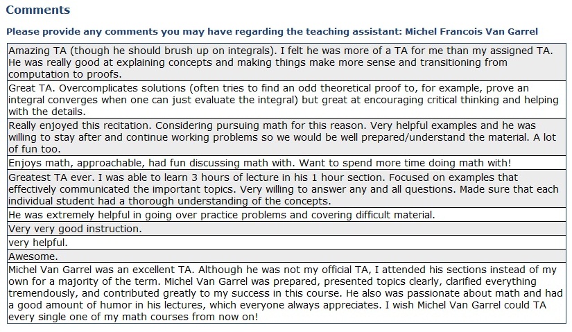 In May 2011, I obtained the Apostol Award for Excellence in Teaching. Here are some teaching evaluations of classes I TAed during my time as a graduate student at Caltech.